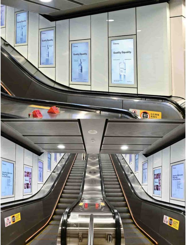 这是一场大规模的广告活动,单是在港铁站内就进行了大量重复曝光。从轨道旁的灯箱、行人通道屏幕、到隧道墙贴……许多主要车站都以这个广告企划进行全面装饰。在一次通勤中,你可能在多个接触点看到相同的视觉设计。这样做有什么效果?即使是没有购物计划的人,也会立刻记住这个品牌。这种饱和度能让品牌深植人心。