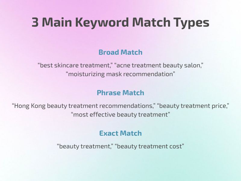 Google offers three main match types: Broad, Phrase, Exact. Using beauty treatments as examples: