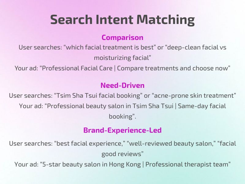 Ad message: headline like “Professional beauty salon in Tsim Sha Tsui | Same-day facial booking”.